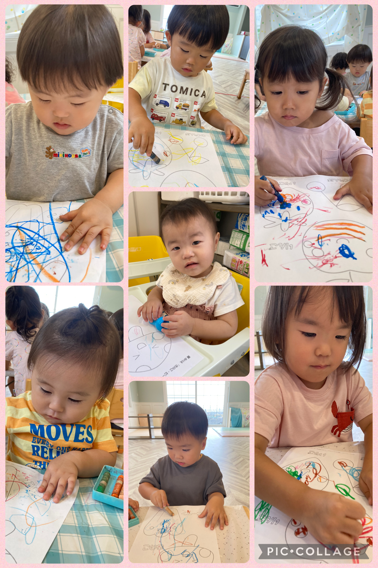 2歳児さんは色々な色で塗って、カラフルな果物🍒🍎が出来ましたよ✨