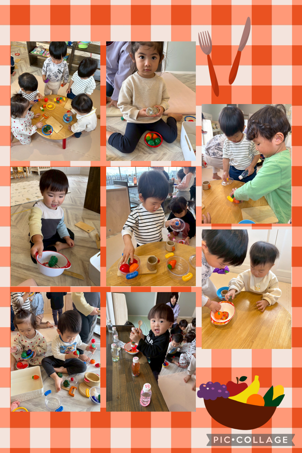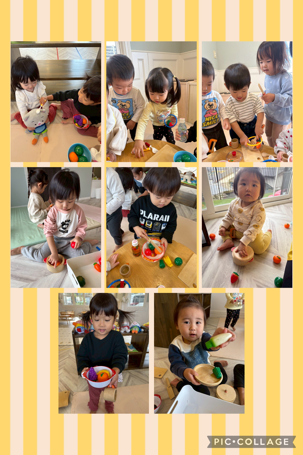 ままごと遊び🥦🍓では、お鍋やお皿に果物や野菜をいれて、ぐるぐるとかき混ぜ、料理を🧑🍳作っていましたよ☺️