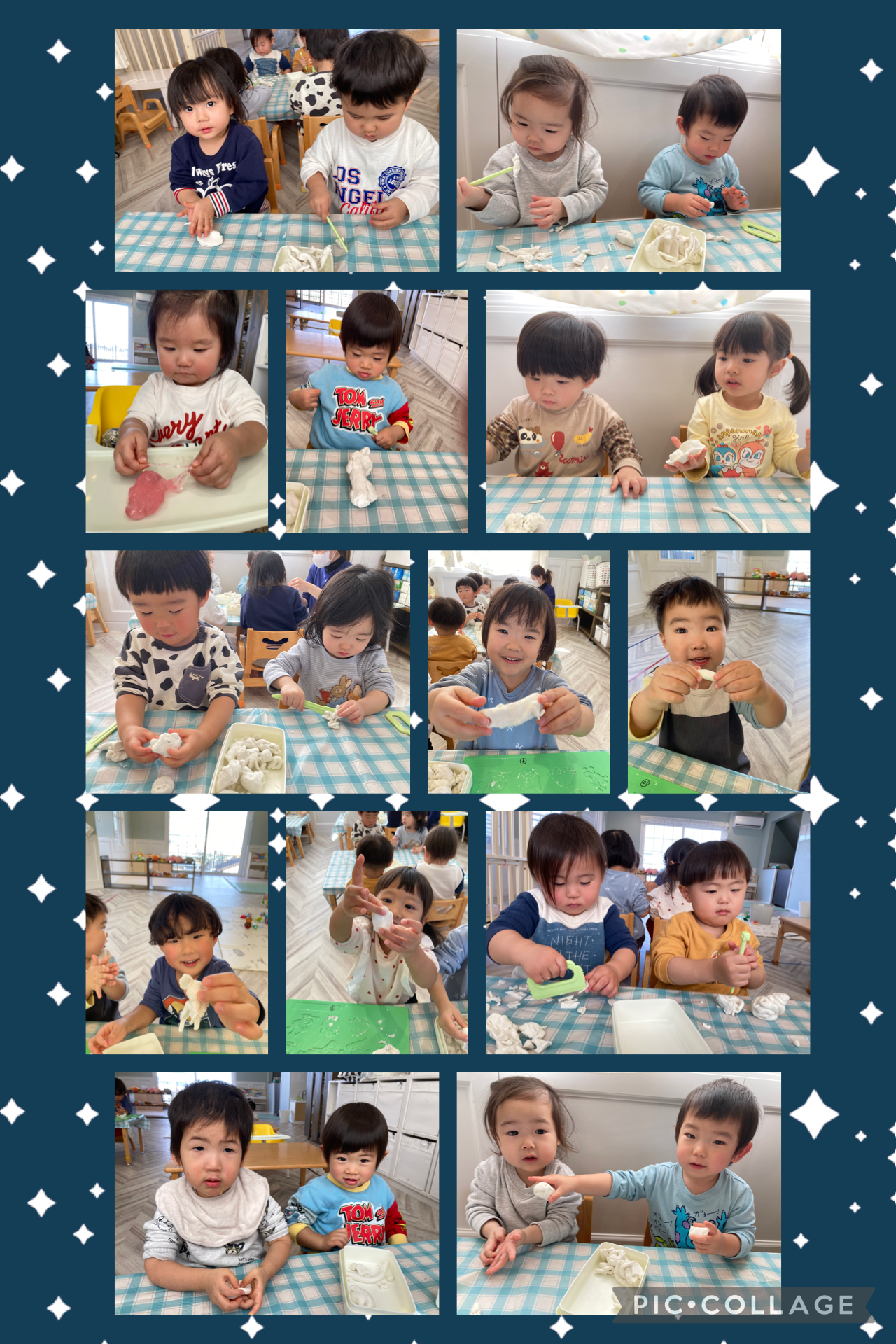 2歳児さんは「カニ🦀」「クッキー🍪」「ヘビ🐍」と作ったのを先生に教えていましたよ😊
