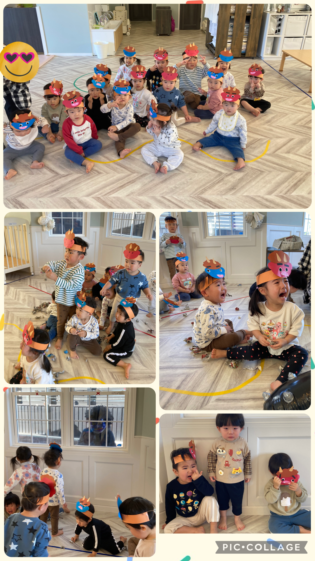 ビックリして泣くおともだち😢もいましたが、みんなで「おにはそと!!」と言って鬼を退治しました👏