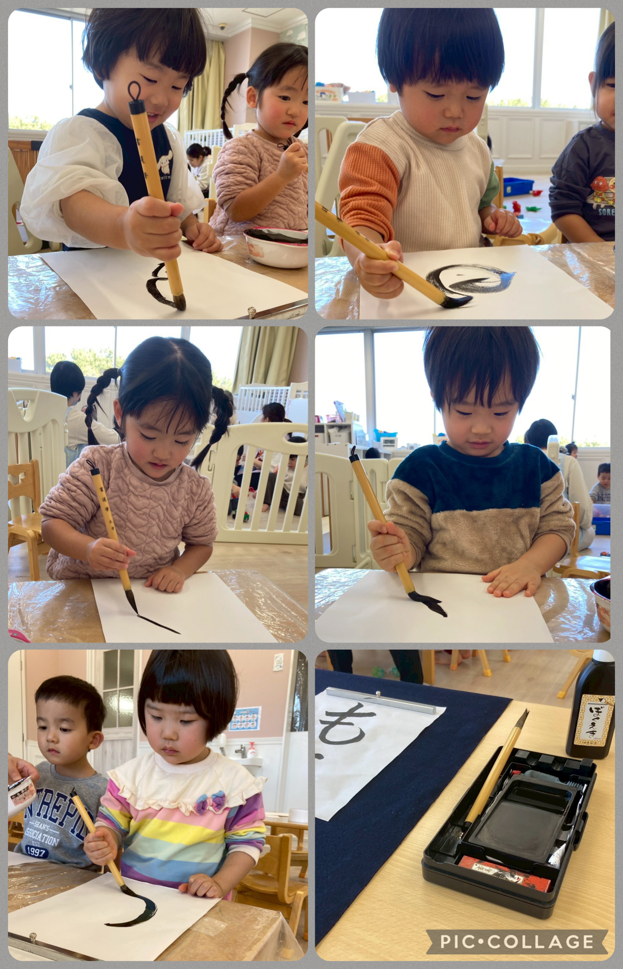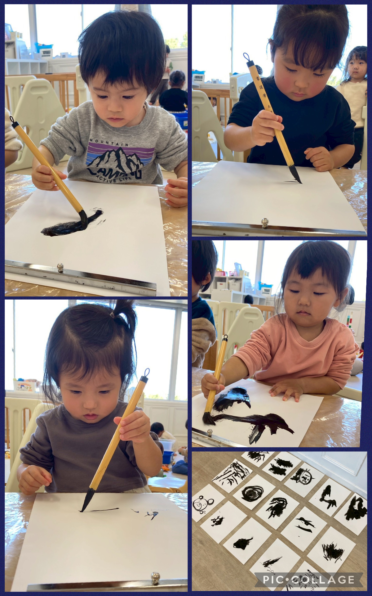腕を大きく動かして、太い線を描いたり、力を抜いて細い線を描いたり、初めての体験に楽しそうな子ども達でした☺️