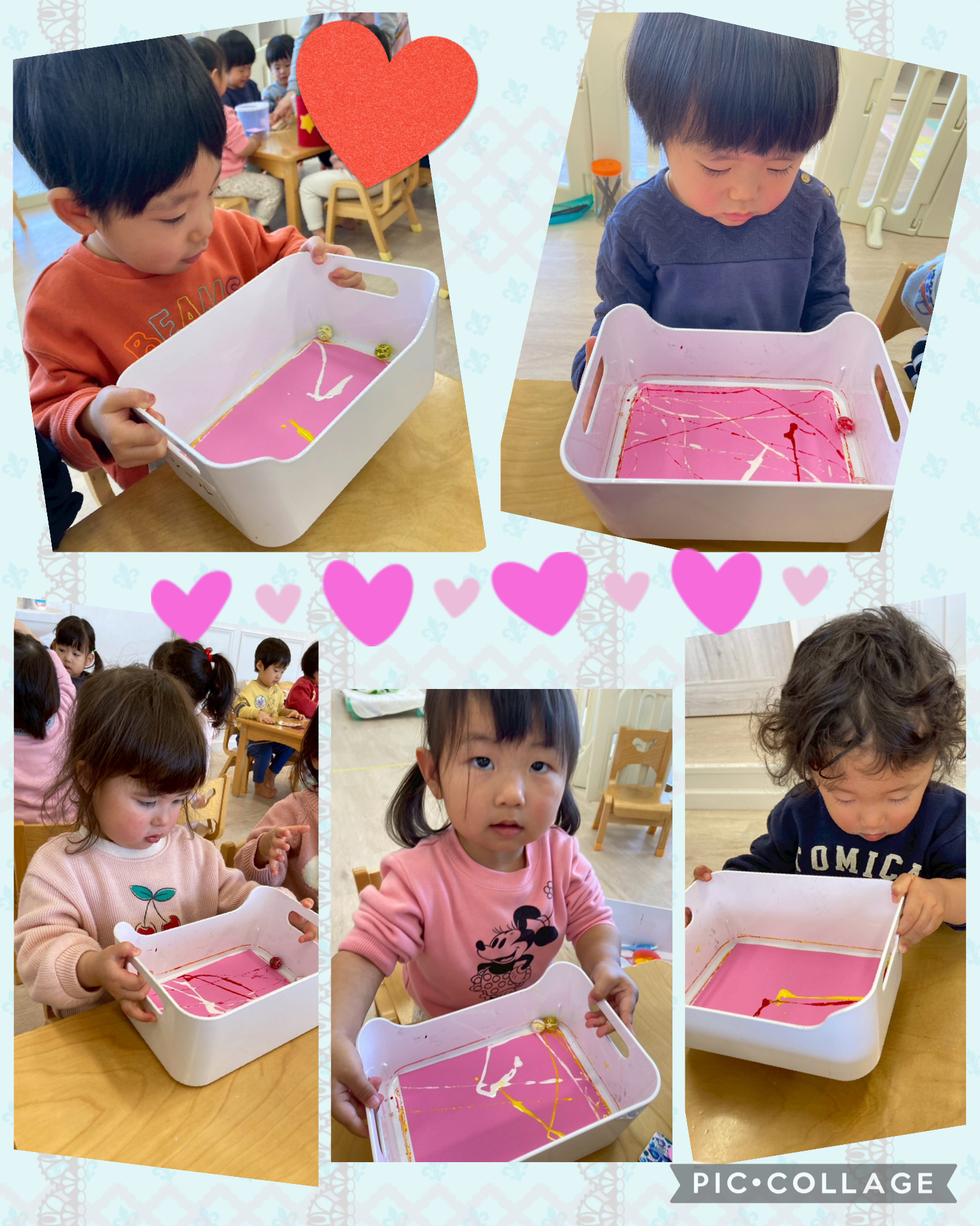 絵の具🎨をつけたビー玉がコロコロ転がり、絵の具がついていく様子を興味津々で見ていましたよ👀