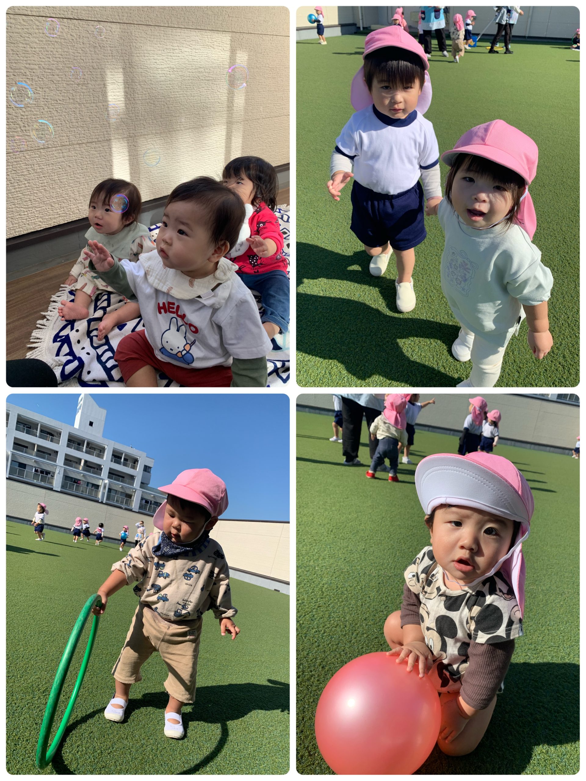 気温が高い日には屋上園庭に出て外気浴をしながら元気に遊びます😀
