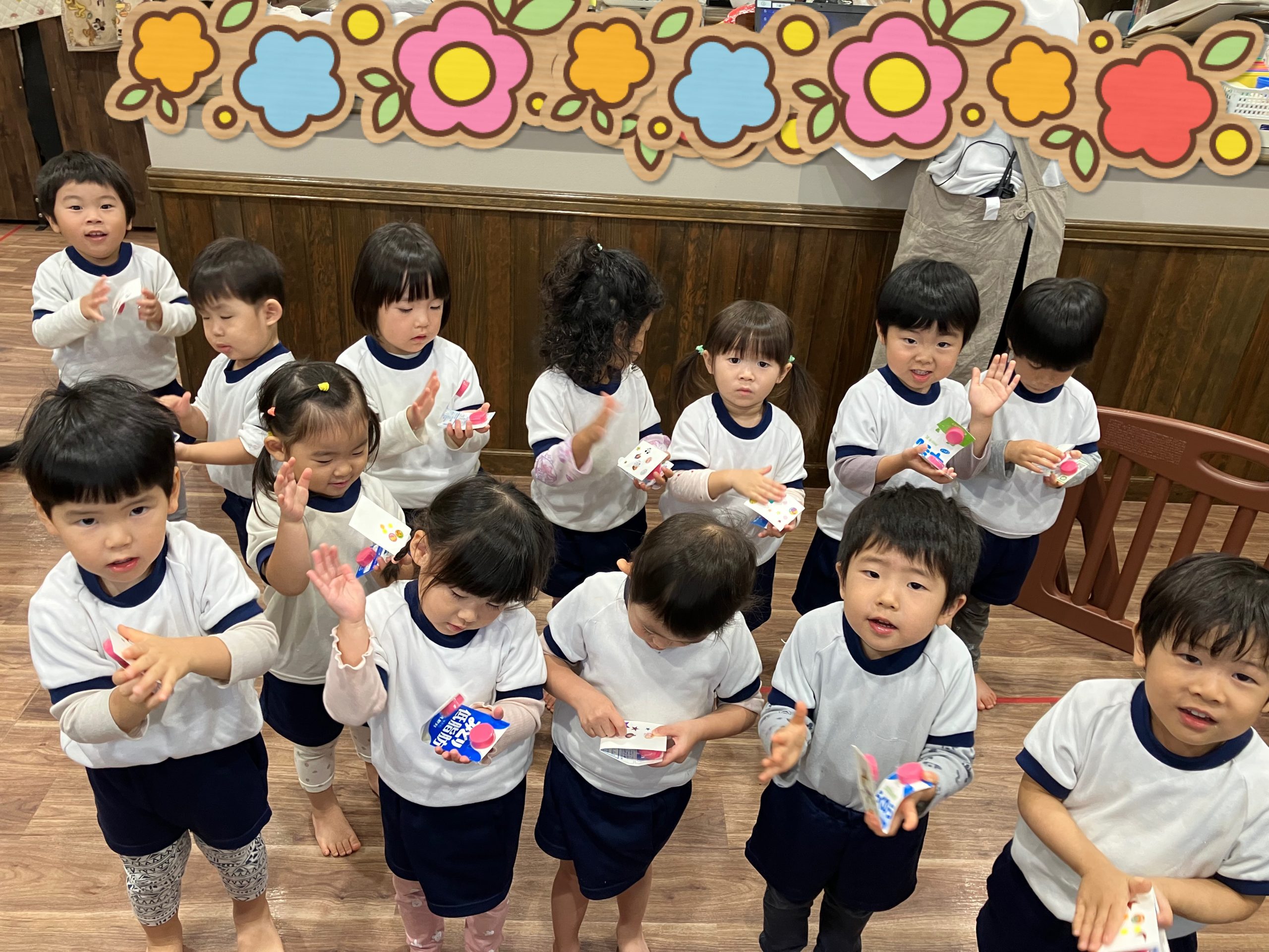 牛乳パックをカスタネットの面に見立てて、中にはペットボトルのキャップを貼りました🙂