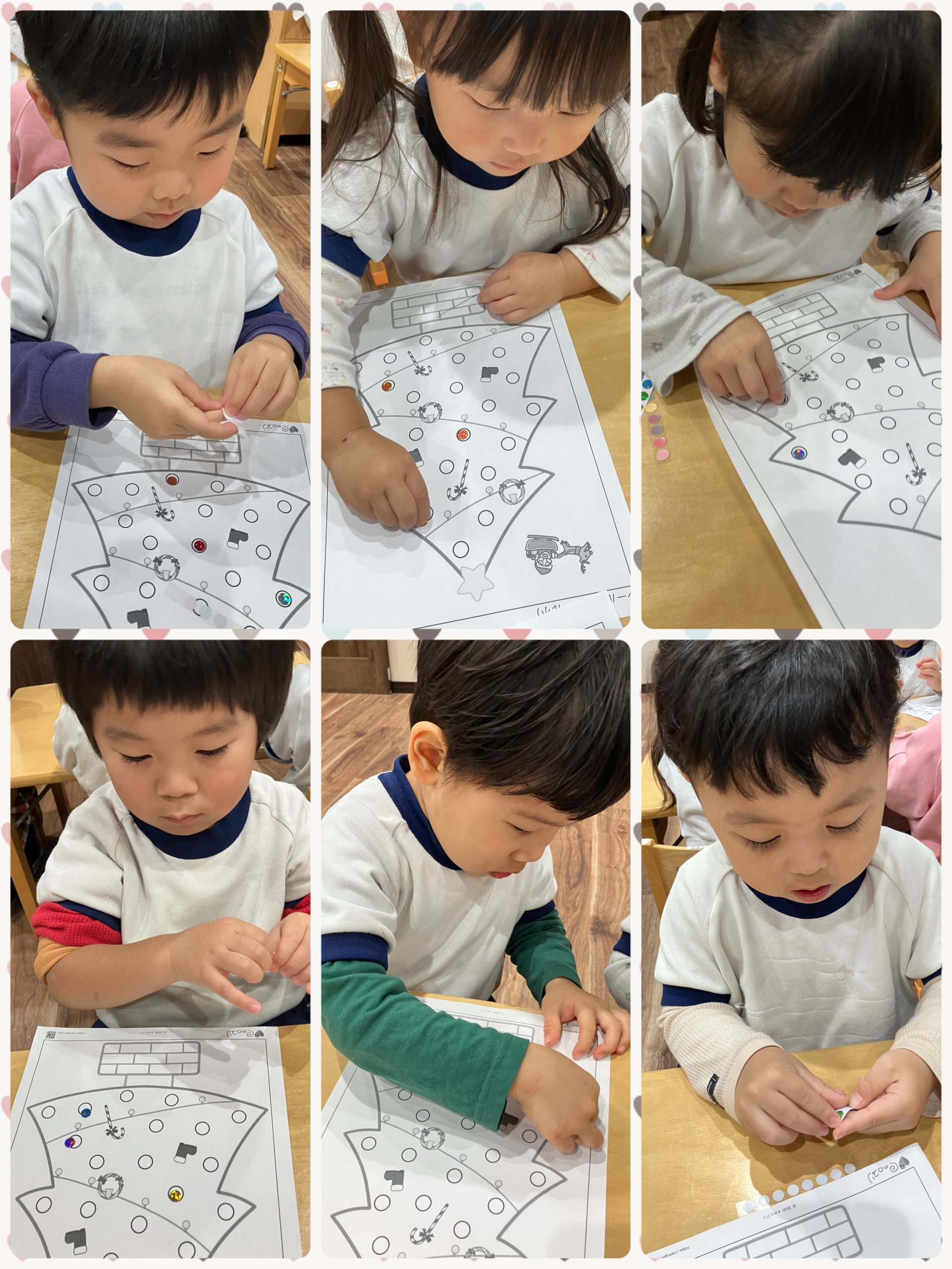 もうすぐクリスマスということで、ツリーの台紙にシール貼りをしました🎄