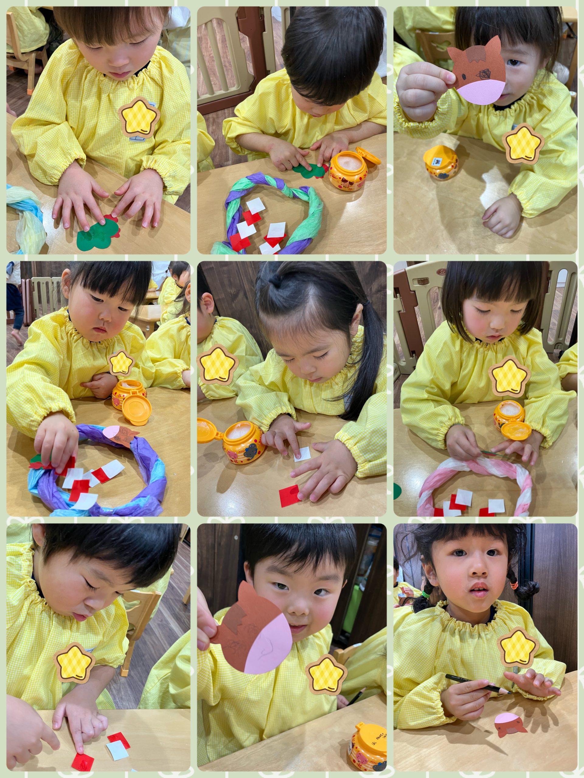 花紙が輪っかになったあとは、午年の午のお顔を描いたり、紙垂や松をのり貼りしたりしました😊