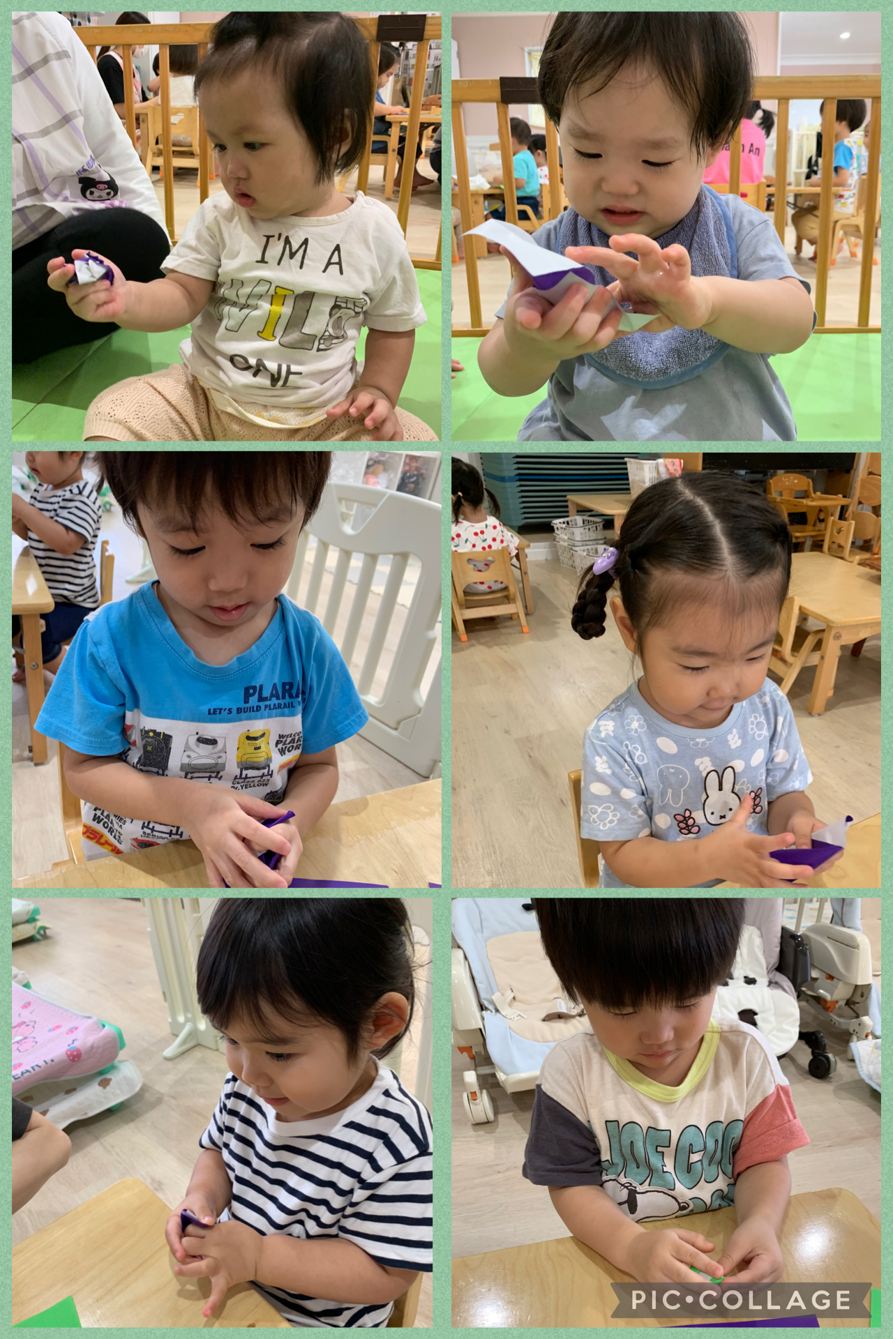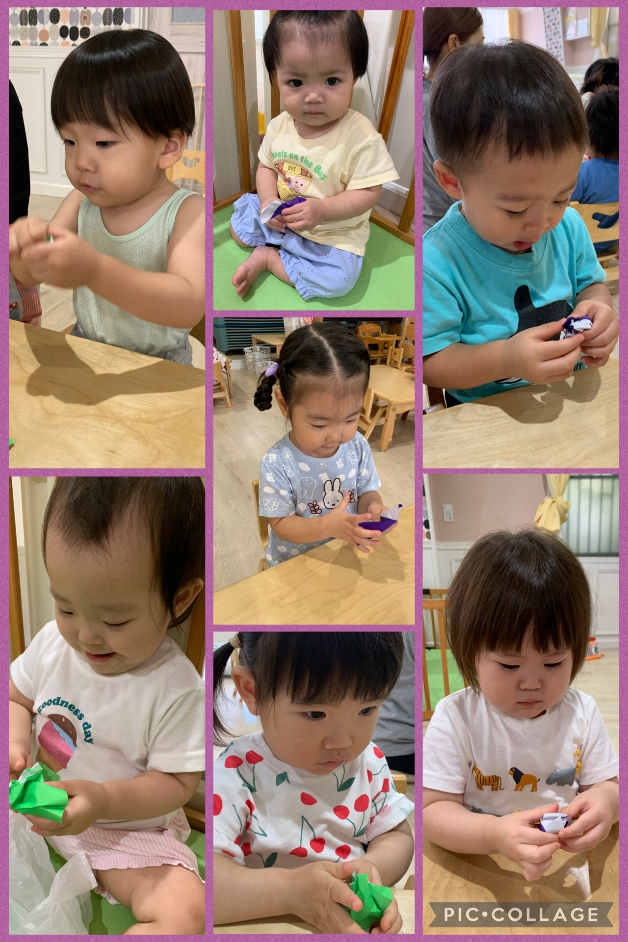 まずは紫と黄緑の折り紙をくしゃくしゃと丸めてブドウの実を作りました😆