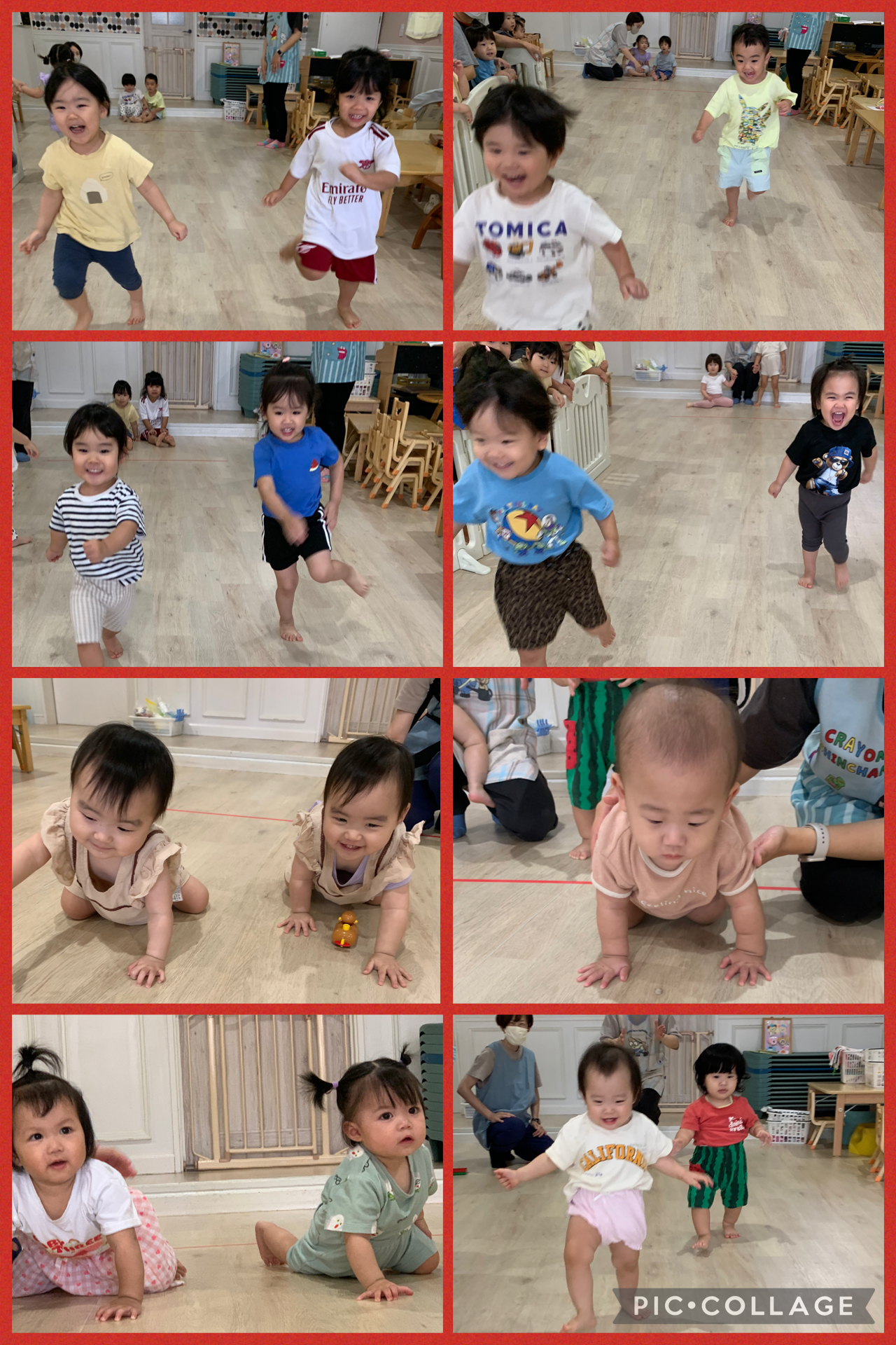 小さなお友達はゴールにいる先生に向かってハイハイで進んでいます🩷