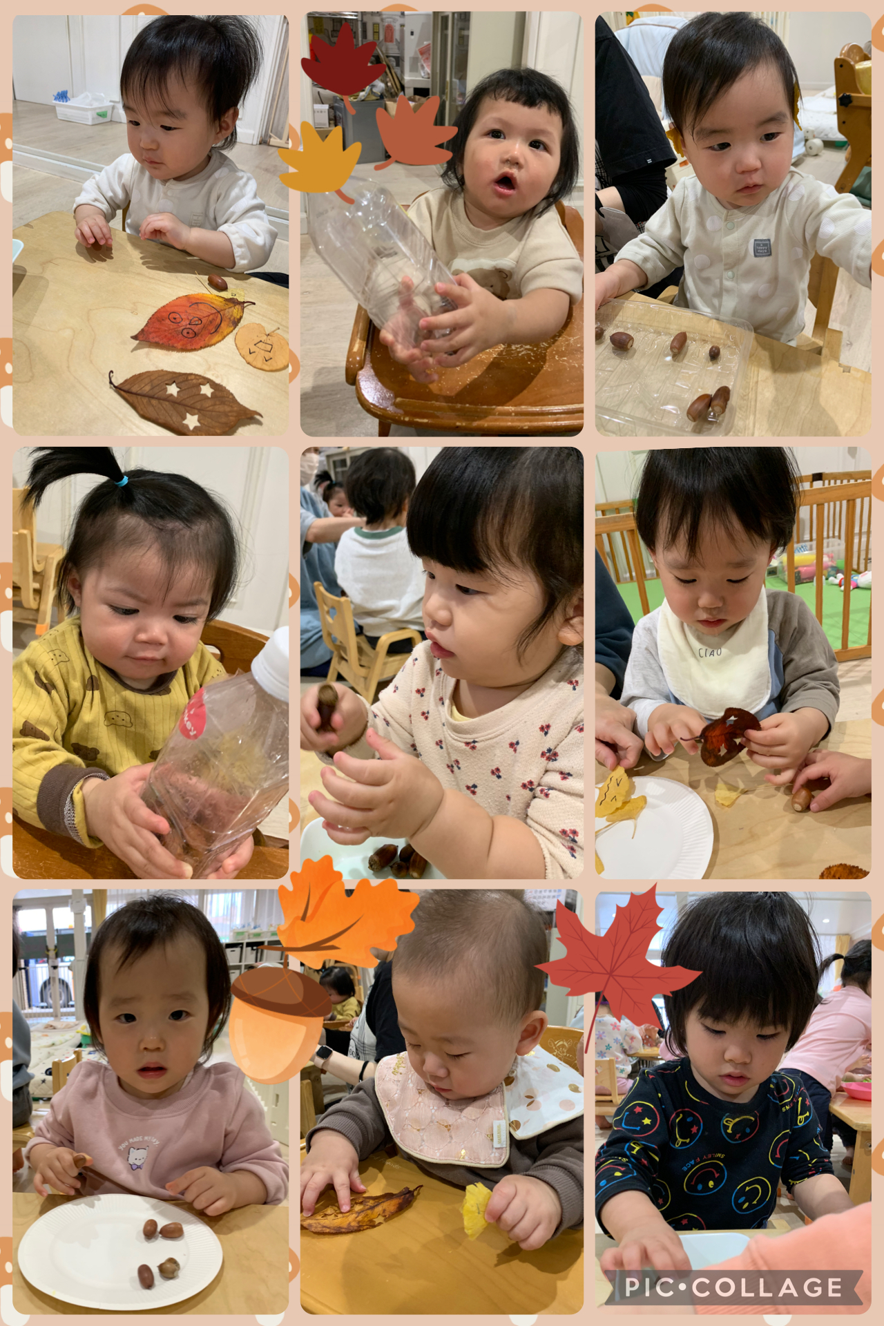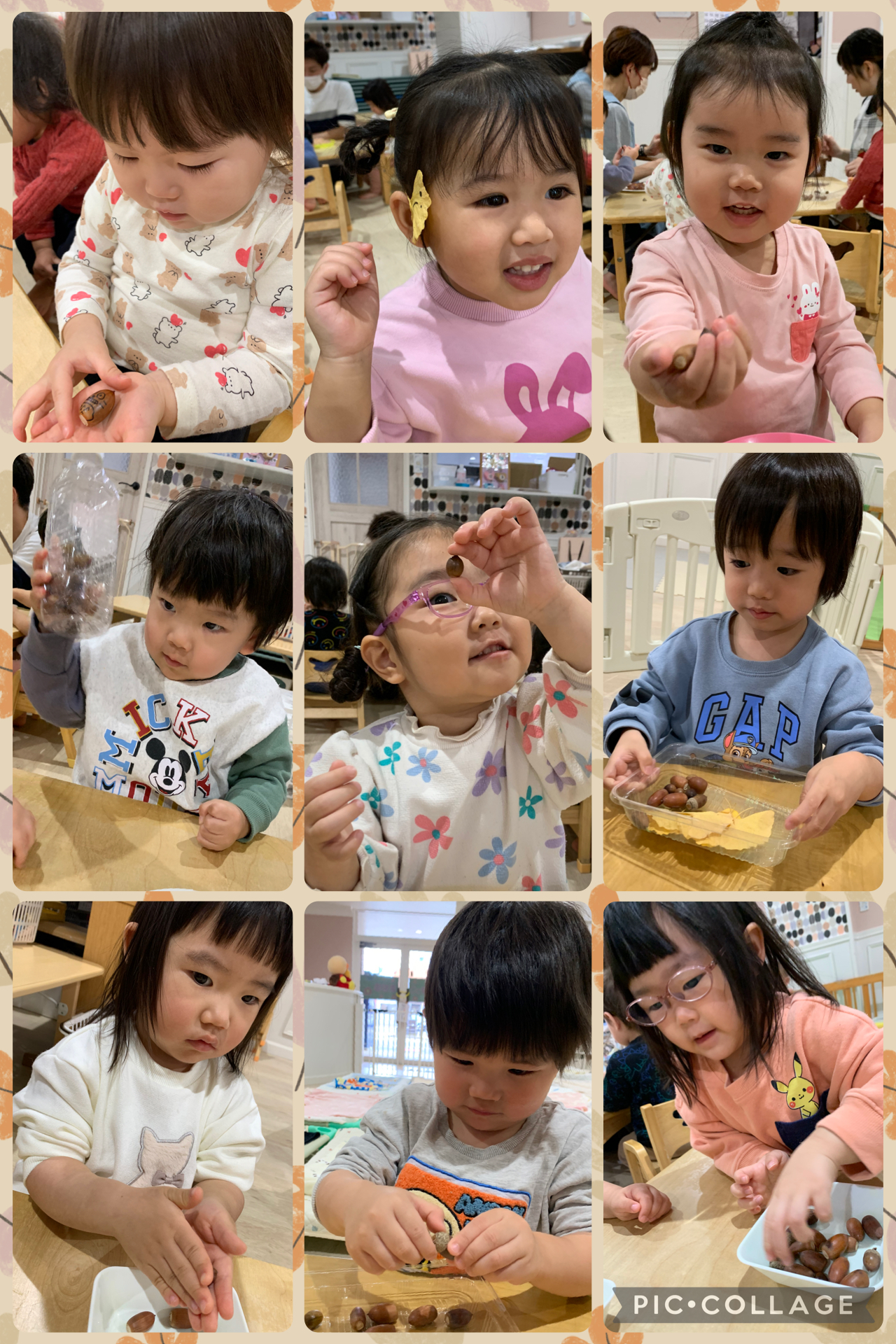 どんぐりや落ち葉を、みんなで触って楽しみました😊🍂
