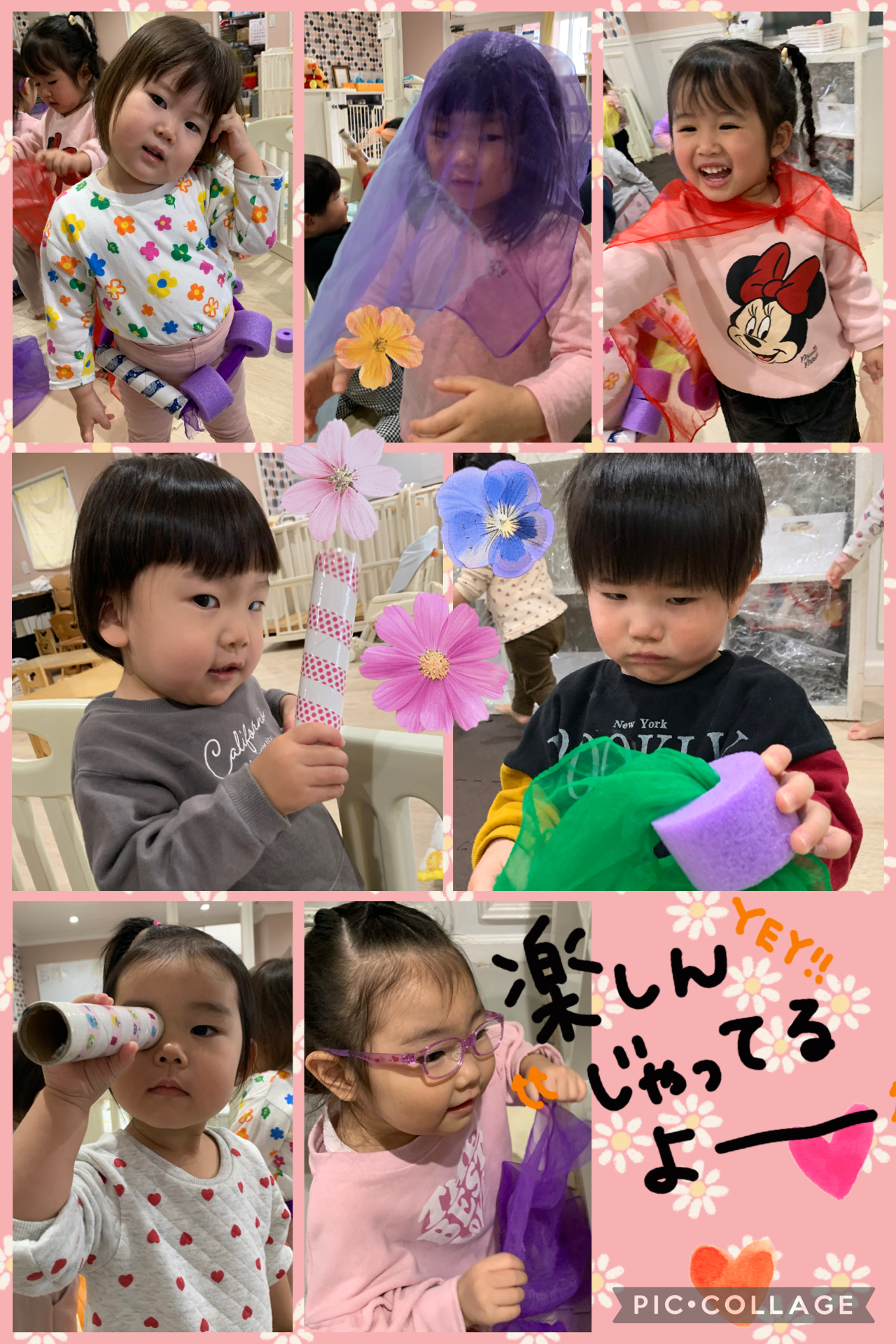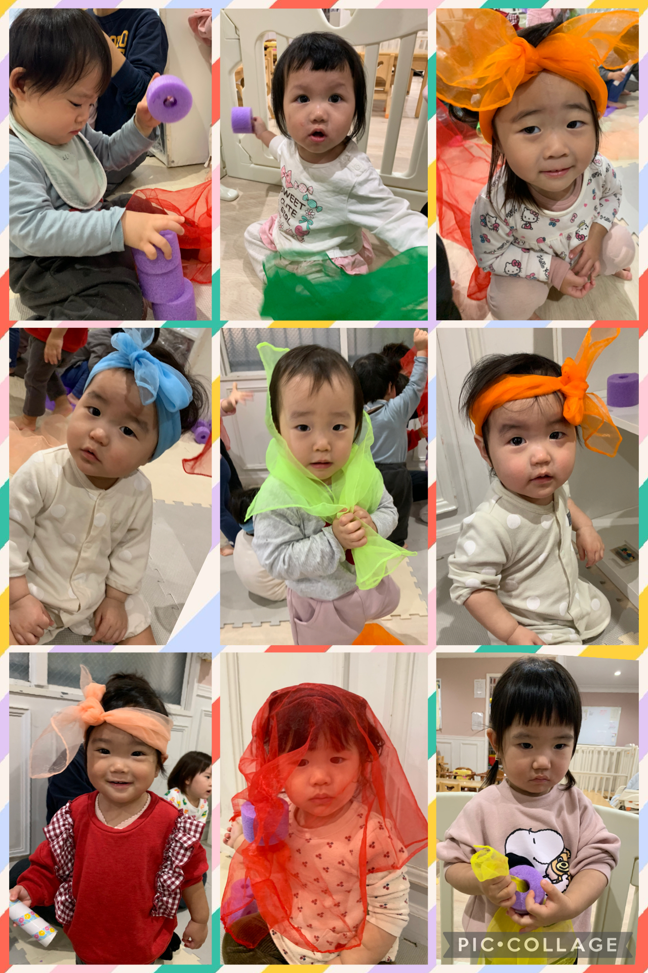 細長い筒やプールスティックにスカーフを通して遊びました😊