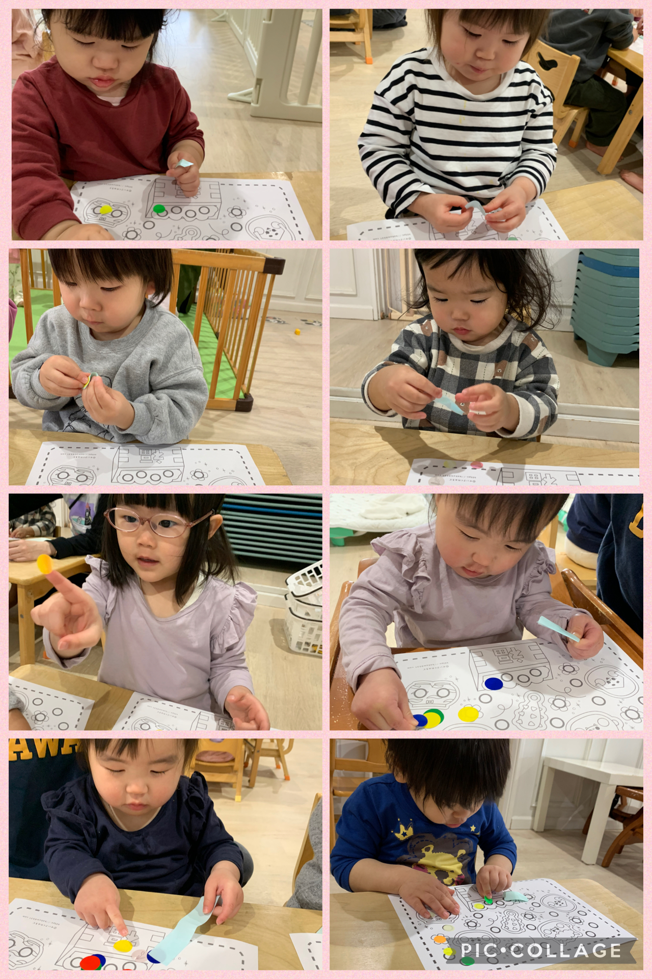 丸の枠の中に真剣にシールを貼るみんなでしたよ😊