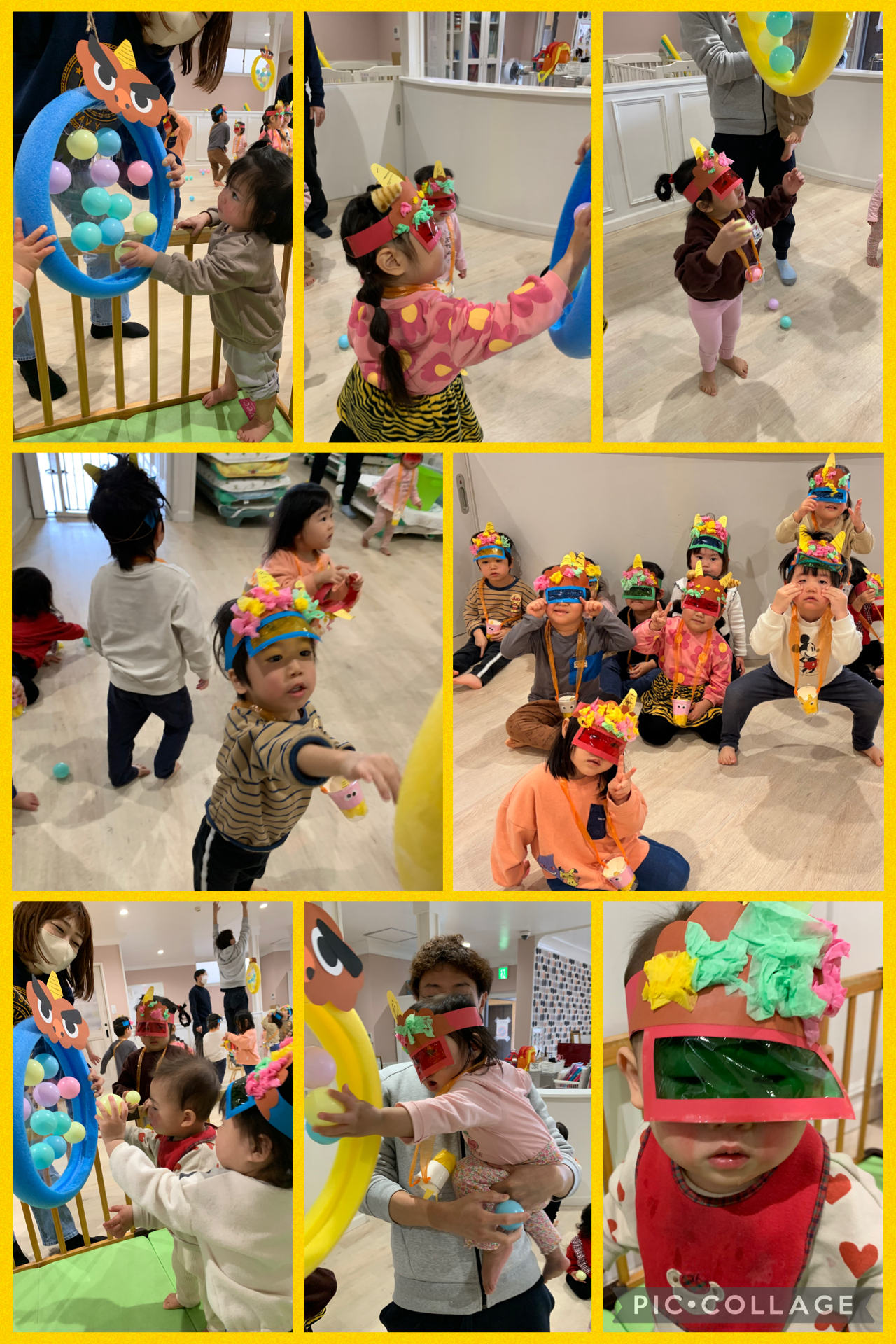 作ったお面と豆入れを身につけてボール投げ遊びをしました🎾