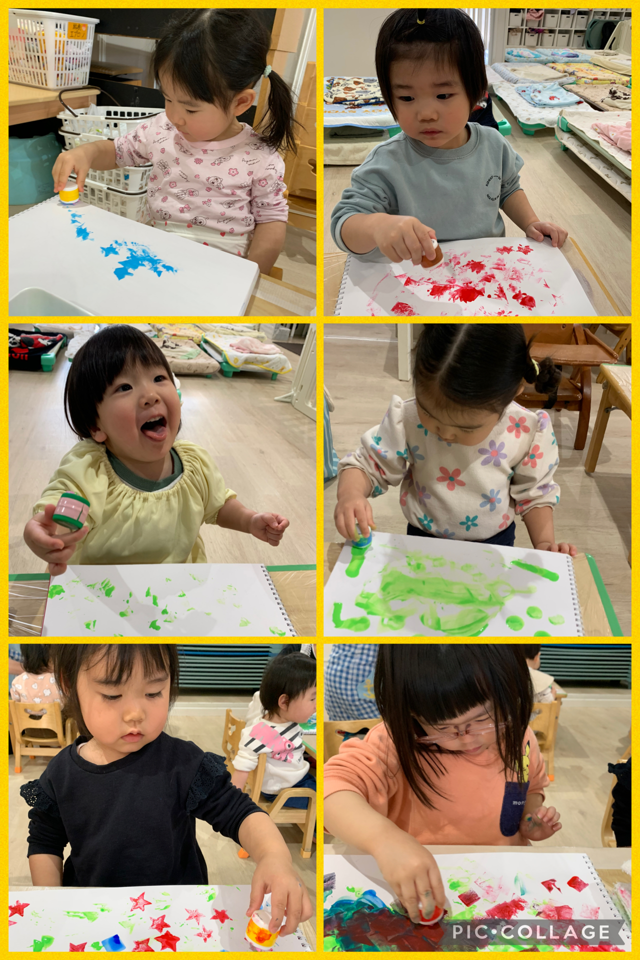 色が混ざるという新たな発見をすると、いろんな色のスタンプを押して試していましたよ✨