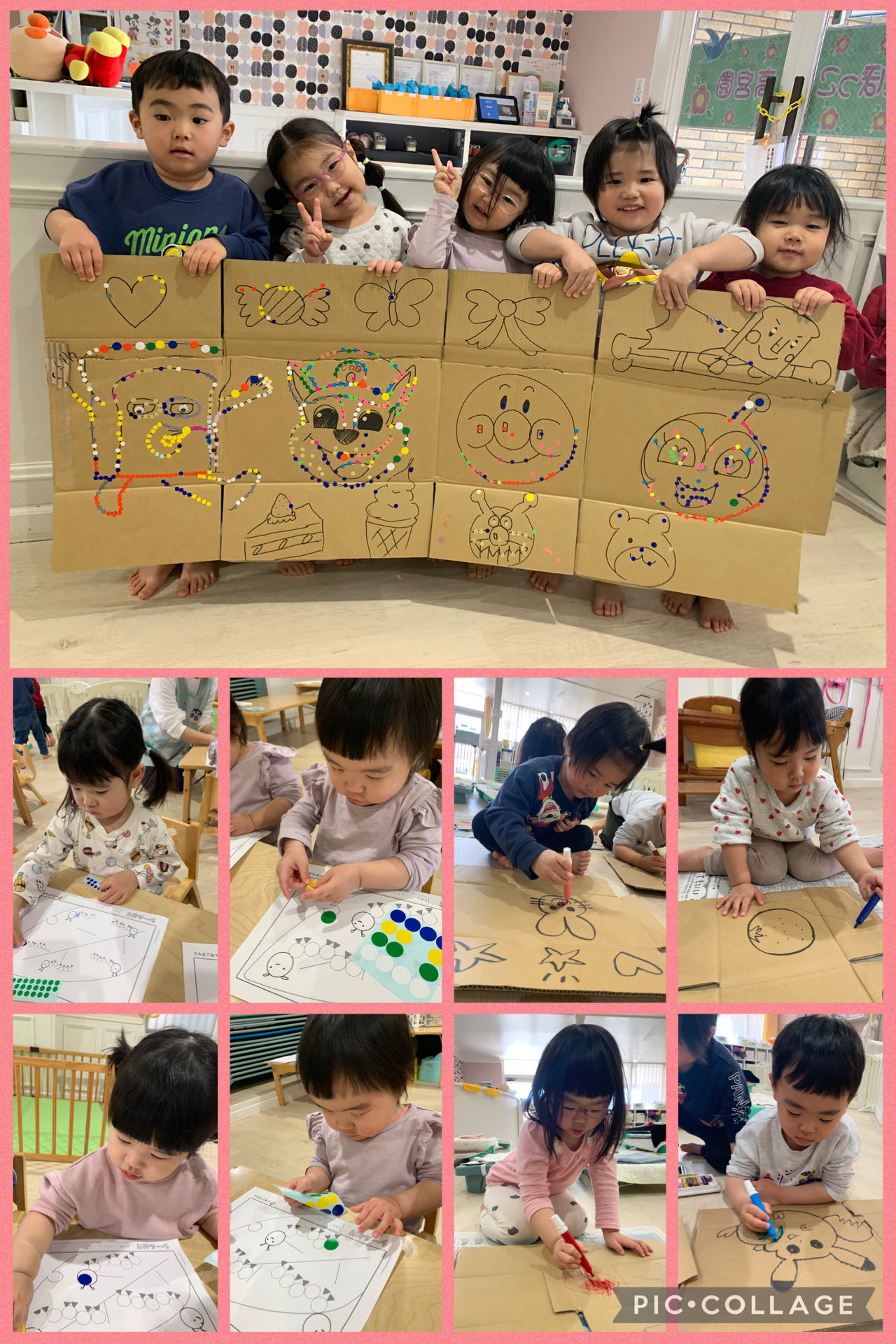 お絵描き遊びでは、2歳児さんは大きな段ボールにマーカーで色を塗ったり、丸シールで枠をなぞって大作を完成させていましたよ👏✨
