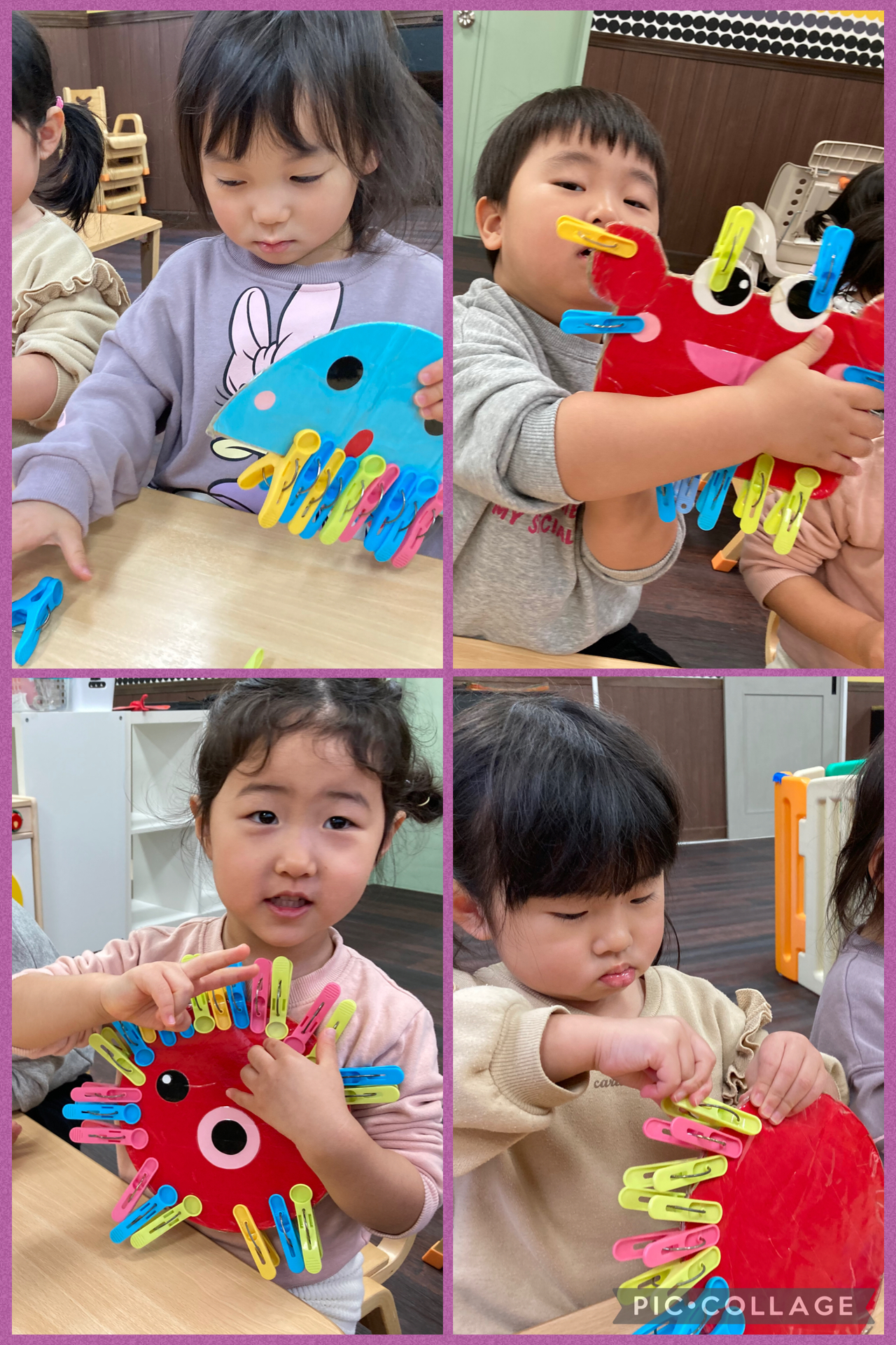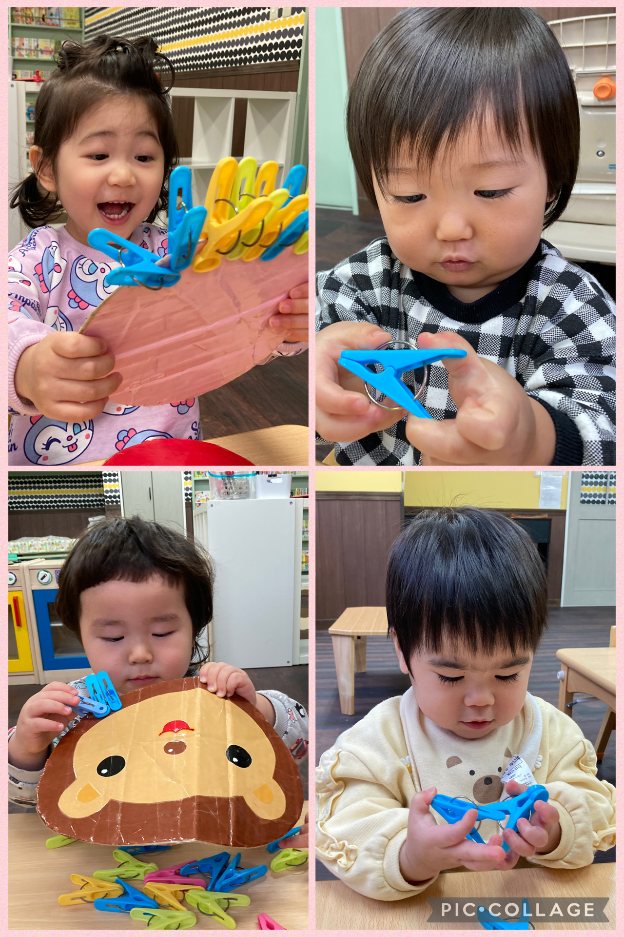 2歳児さんは動物の型紙に合わせて、上手に洗濯バサミを挟んでいました😄