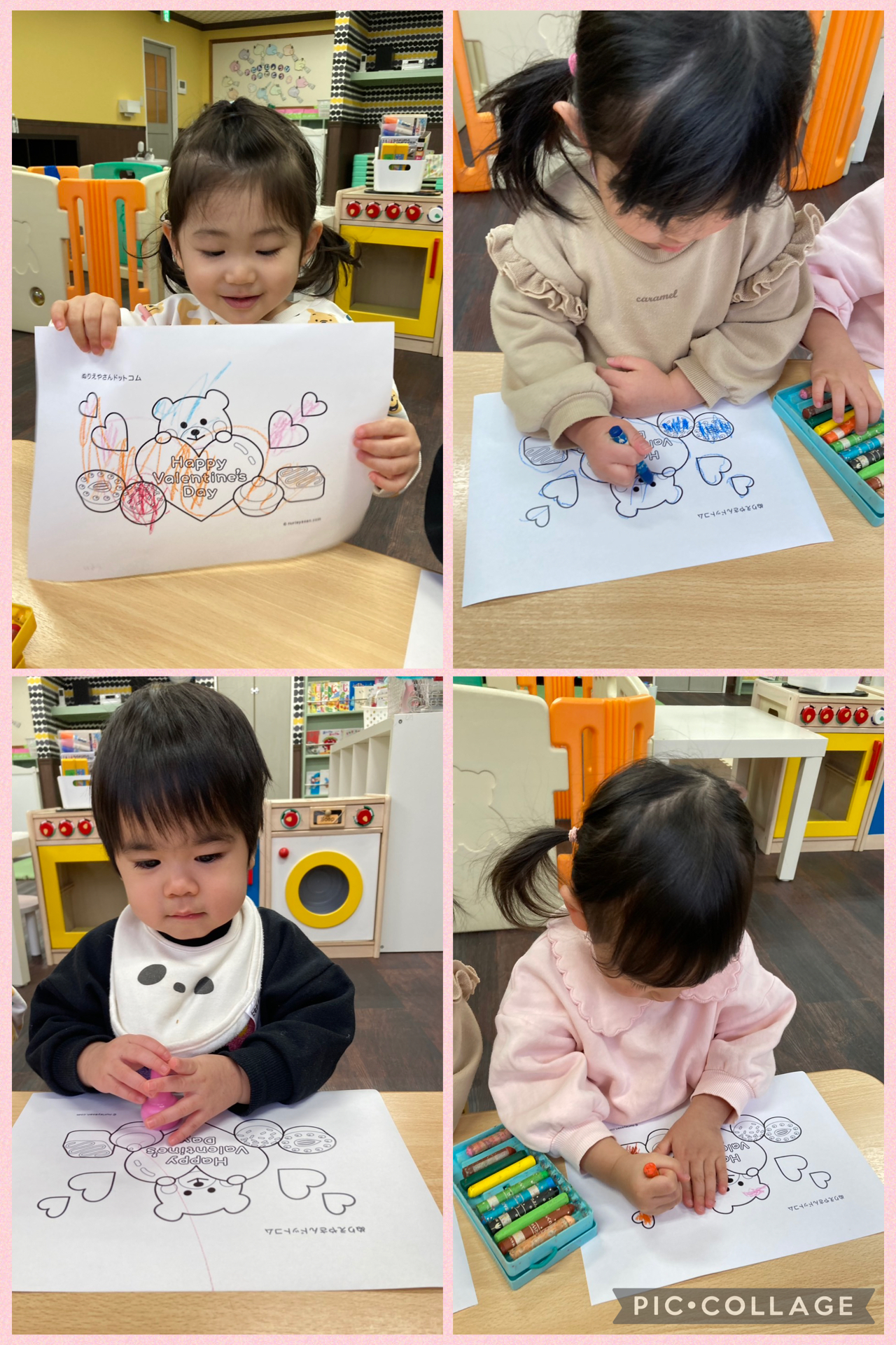 バレンタインの日が近かったのでバレンタインのぬりえをしたりはーとの形に切った画用紙を貼ったりしてバレンタイン気分を味わいました❤🍫🎁