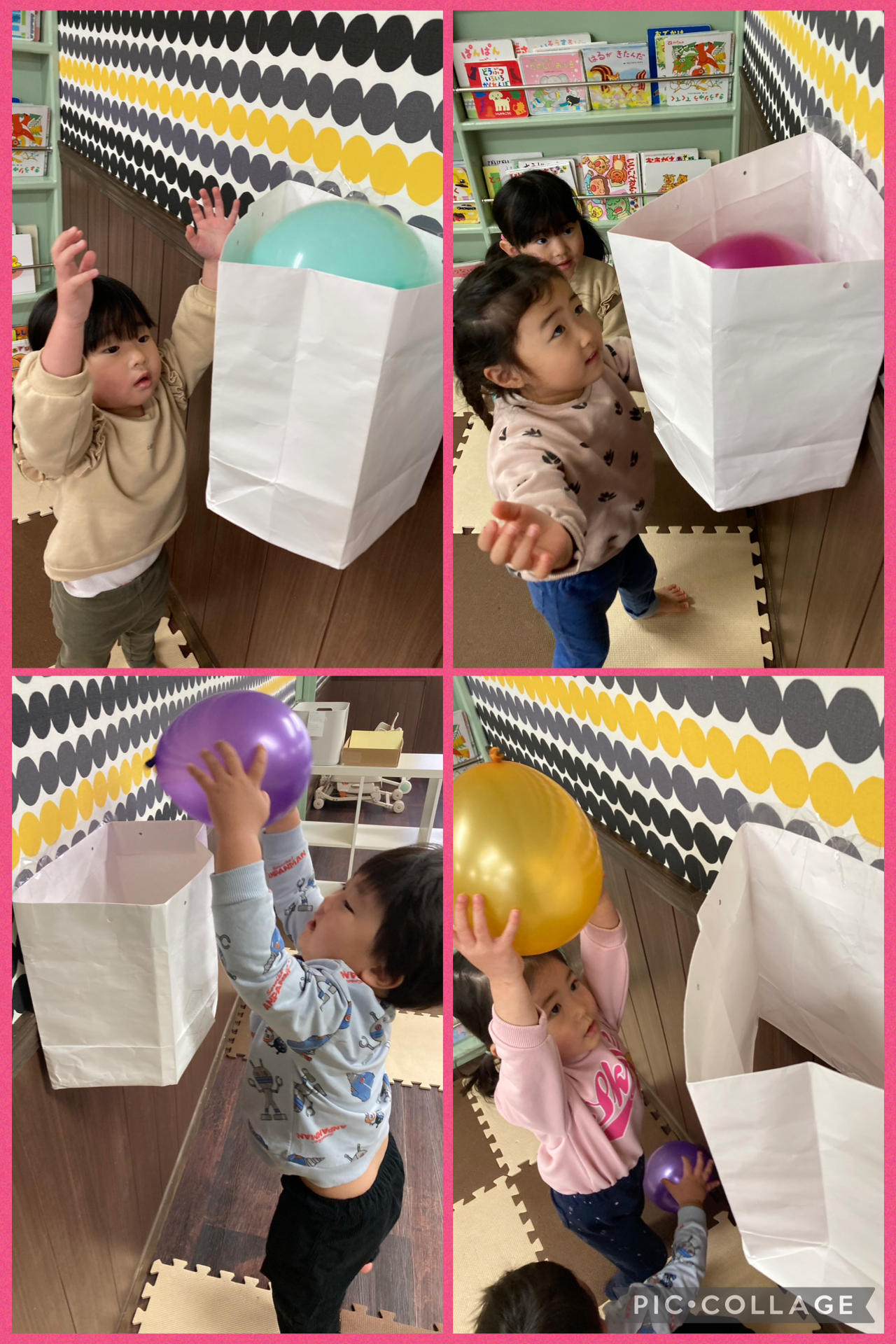 別の日には風船遊びで体をたくさん動かしたり紙袋でバスケットゴールに見立ててゲーム感覚で遊んだりして遊びました🎵🌟