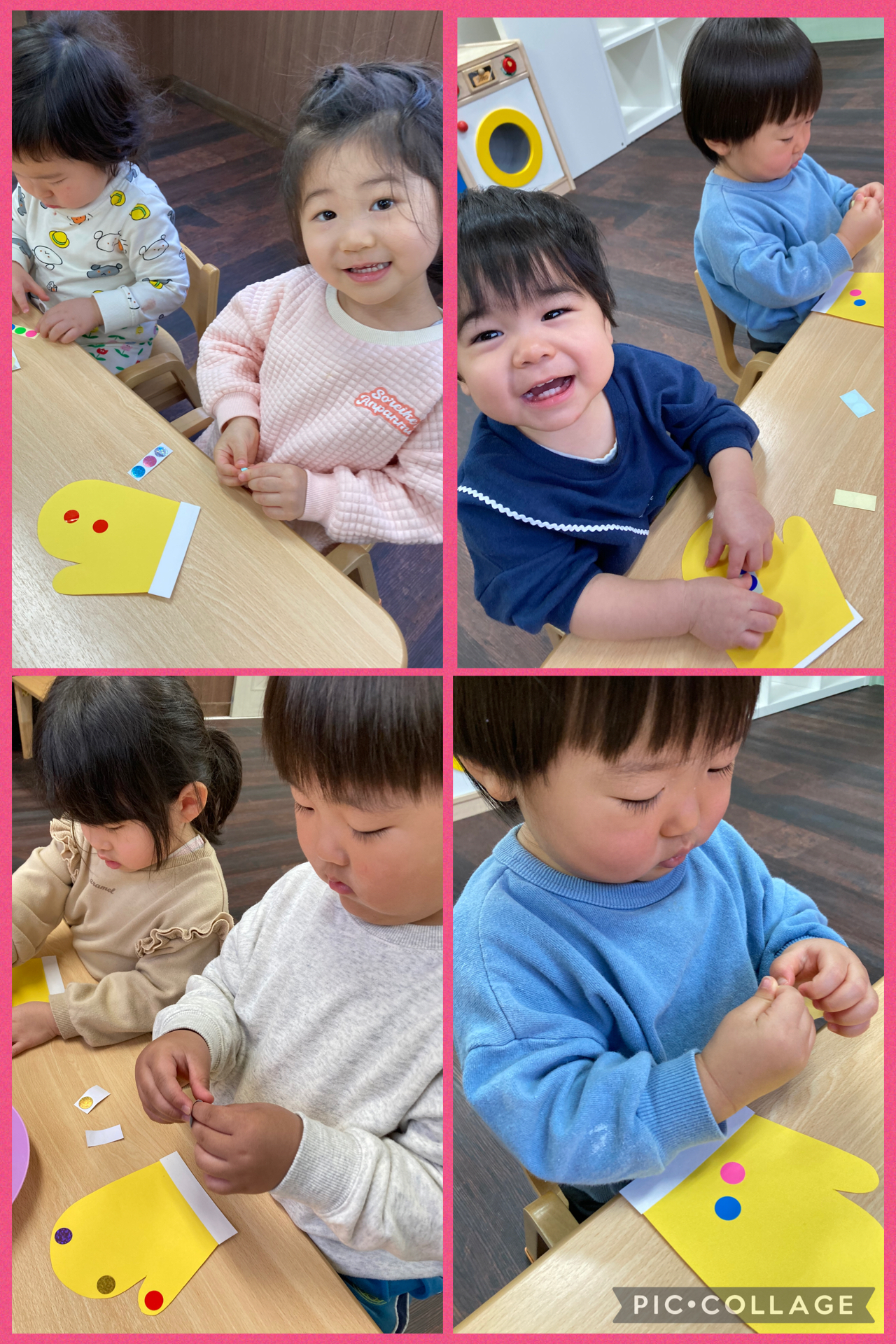 0.1歳児さんのお友達はチェック柄の折り紙を四角に切ったものを、のりで貼ったりカラフルな色の丸シールをたくさんつけて、かわいいドット柄にデコレーションしました✅💕