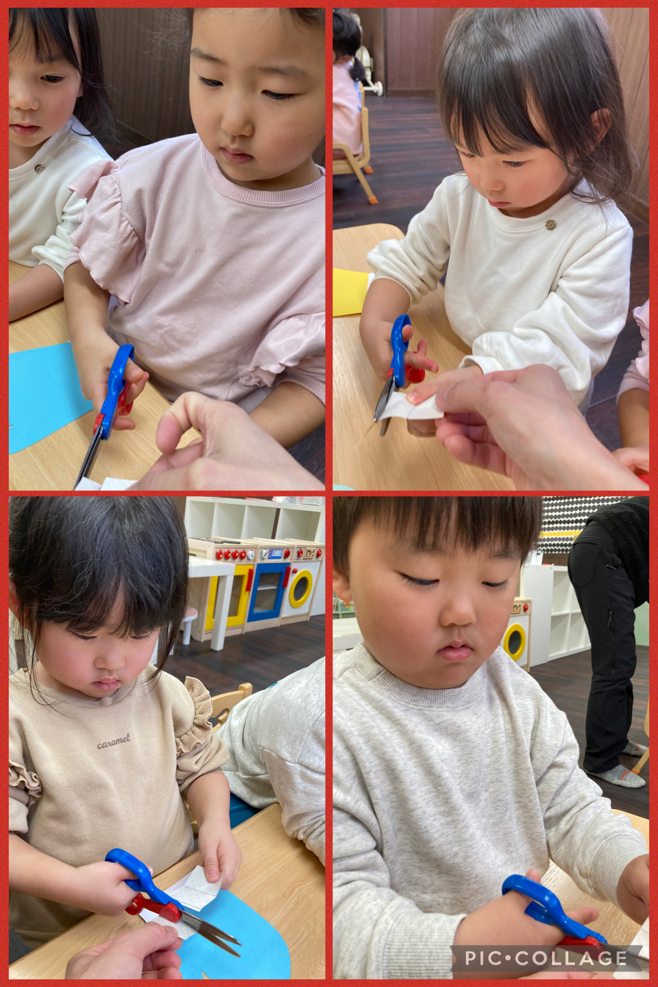 2歳児さんは、折り紙をハサミ✂️で切るところから、挑戦しました!✨